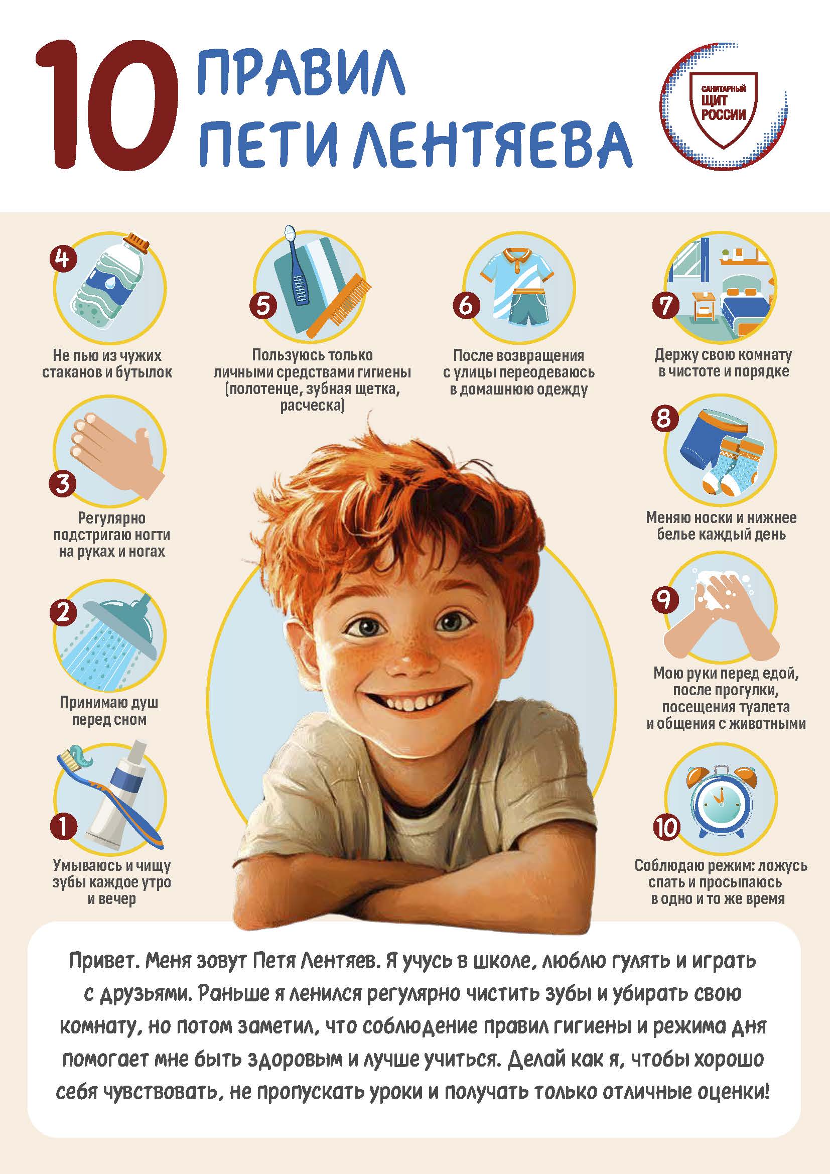 21.11.2024Привет. Меня зовут Петя Лентяев. Я учусь в школе, люблю гулять и играться друзьями. Раньше я ленился регулярно чистить зубы и убирать свою комнату, но потом заметил, что соблюдение правил гигиены и режима дня помогает мне быть здоровым и лучше учиться. Делай как я, чтобы хорошо себя чувствовать, не пропускать уроки и получать только отличные оценки!